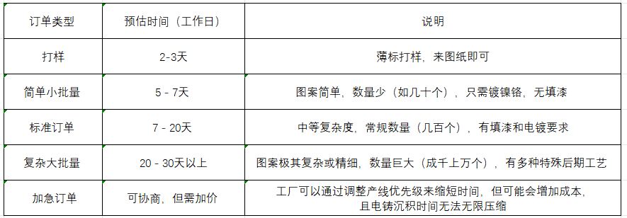 2. 訂單數(shù)量:批量越大,電鑄沉積的時間越長,后期加工(如切割、填漆)的時間也相應增加。